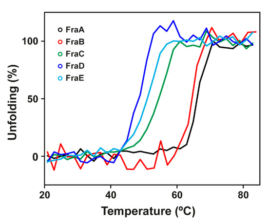 The thermal stability of the toxins was monitored by the change of ellipticity in the far-UV region (210 nm) with increasing temperature (Figure 3). The midpoint of the unfolding transition (TM) of the proteins was determined. The most stable isoforms were FraA and FraB as judged by their higher TM values (TMFraA = 65 ± 1 °C, TMFraB = 62 ± 2 °C), followed by FraC, FraD, and FraE (TMFraC = 53 ± 3 °C, TMFraD = 47 ± 1 °C, and TMFraE = 51 ± 1 °C) (Table 1).