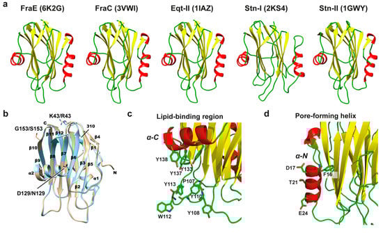 Three-dimensional structure of actinoporins. (a) Comparison of the crystal structure of FraE (6K2G, this work) with FraC (3VWI), Eqt-II (1IAZ), Stn-I (2KS4), and Stn-II (1GWY). Actinoporins form a characteristic β-sandwich flanked by two α-helices. Random coils are depicted in green, α-helices in red, and β-sheets in yellow. (b) Secondary structure elements in the structures of FraC (PDB entry code 3VWI, gold) and FraE (PDB entry code 6K2G, cyan), which were superimposed for the figure. The secondary structure elements β-sheet (β), α-helix (α), and 310 helix (310) are indicated. The side chains of the variable residues Lys/Arg43, Asp/Asn129, and Gly/Ser153 are also shown. Letters C and N refer to the C- and N-terminus, respectively. (c) Close-up view of the lipid-binding region in FraE comprising a large number of aromatic residues along the C-terminal α-helix and a protruding hydrophobic loop. (d) N-terminal region in FraE depicting the N-terminal α-helix involved in membrane insertion during pore formation. The figure was made with CHIMERA [27].