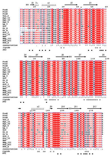 Multiple sequence alignment of actinoporins. Alignment of seventeen actinoporin sequences with >60% identity: FraB (MK936900), FraE (MK936901), and FraC (B9W5G6) from Actinia fragacea; tenebrosin-C (Ten-C, P61915) from A. tenebrosa; equinatoxin II (Eqt-II, P61914), equinatoxin IV (Eqt-IV, Q9Y1U9), and equinatoxin V (Eqt-V, Q93109) from A. equina; bandaporin (bp-1, C5NSL2) from Anthopleaura asiatica; cytolysin UcI (P0CG44) from Urticina piscivora; cytolysin Or-G (Q5I2B1) and cytolysin Or-A (Q5B4I8) from Oulactis orientalis; sticholysin I (Stn-I, P81662) and sticholysin II (Stn-II, P07845) from Stichodactyla helianthus; cytolysin HmT (P0DMX2) and magnificalysin III (HMg-III, Q9U6X1) from Heteractis magnifica; and cytolysin RTX-SII (P0C1F8) and cytolysin RTX-A (P58691) from Heteractis crispa. The alignment was built with webPRANK [28] and colored in ESPript 3.0 [29] by conservation: red background, red letters, and black letters denote the degree of conservation of single residues in descending order. The degree of conservation at each position was determined with Clustal Omega [30]: identical (*), strongly (:), and weakly conserved (.). Non-conserved positions are represented by an empty space. White and black circles indicate residues involved in lipid–protein (lipids) and protein–protein interactions (PPI) [10]. The secondary structure elements β-sheet (β), α-helix (α), and 310 helix (310) are depicted above the sequences and correspond to those shown in Figure 4b. Turns are labelled with the letter T, and loops are not labeled. Gray stars indicate different residues between FraC and FraE.
