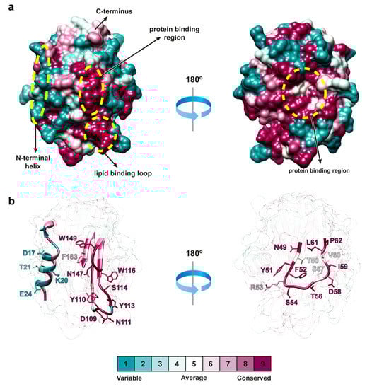 Evolutionary variability of actinoporins. (a) Surface area representation of FraE (PDB code 6K2G, this work) color-coded according to the evolutionary variability of actinoporins (see color legend). The N-terminal helix, the protein-binding region and the lipid-binding region are circled in yellow. These three regions are shown in ribbon representation in (b). Mapping the evolutionary variability of residues on the crystal structure was made in the Consurf server [33].