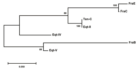Evolutionary divergence tree of actinoporins from the genus Actinia. One cluster groups FraE, FraC, tenebrosin C (Ten-C), equinatoxin II (Eqt-II), and equinatoxin IV (Eqt-IV) and a second cluster groups FraB and equinatoxin V (Eqt-V). The length of the branches (number of substitutions per site expressed as parts per unit) determines the evolutionary distance from the common ancestor until speciation or until present. Confidence levels to assess the degree of relatedness of the proteins in a clade (bootstrap values) are shown next to the branches. The tree was built with MEGA X [34].