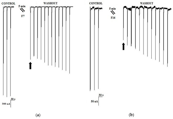 Representative current traces displaying the effect of active peptidic fractions (at 0.07 µg/µL) from C. princeps venom on human α7 nAChRs. (a) F7 fraction; (b) F16 fraction.