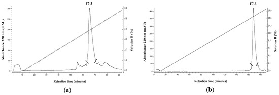 Purification of an active peptide of C. princeps venom by RP-HPLC. (a) F7 fraction: after an isocratic step at 10% Solution B for 10 min, followed by a linear gradient of 10% to 30% (v/v) of Solution B, over 200 min, at 1 mL/min was used. (b) F7-3 peptide: after an isocratic step at 0% Solution B for 10 min, followed by a linear gradient of 0% to 20% (v/v) of Solution B, over 200 min, at 0.8 mL/min was used. The absorbance was measured at 220 nm. Only the F7-3 peptide collected between the diagonal lines was used for further analyses.