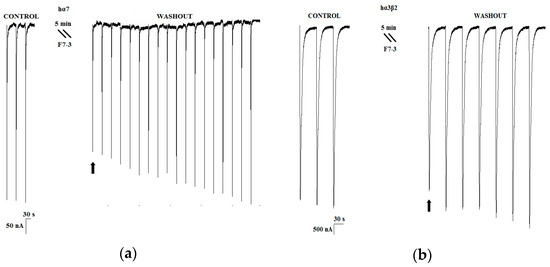 Representative current traces displaying the effect of the purified F7-3 peptide (at 0.07 µg/µL) of C. princeps venom on two human nAChR subtypes. (a) hα7 (n = 4); and (b) hα3β2 (n = 3).