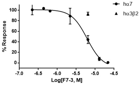 Concentration-response curve for the inhibition of human α7 nAChRs (circles) expressed in Xenopus laevis oocytes by the purified F7-3 peptide of C. princeps venom. The IC50 is 6.2 µM. The effect over human α3β2 (triangles) at 6.5 μM is also shown.