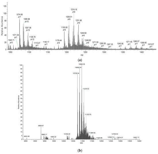 (a) Original mass spectrum of the native purified F7-3 peptide from C. princeps venom, the m/z signal (assuming z = 10) at 1074.56 corresponds to an average mass of 10,735.50 Da, which agrees very well with the m/z signal (z = 9) at 1193.95 which corresponds to an average mass of 10,735.54 Da. “?” denotes that the charge of the ion was not automatically determined by the software. (b) Deconvoluted mass spectrum of the native purified F7-3 peptide from C. princeps venom.
