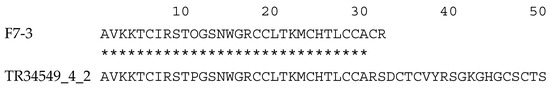 The BLASTP similarity search revealed 25 significant hits (E value ≤ 1 × 10−4) to the F7-3 toxin; except for “conopeptide Mi039 [Conus miles]” the distinct annotations of these hits identify them as αD-conotoxins (data not shown). These toxins are covalent dimers of identical or similar polypeptide chains of ~50 residues containing 10 disulfide bonds in total [2,13,16,17], with two disulfide bonds linking the monomers [2].