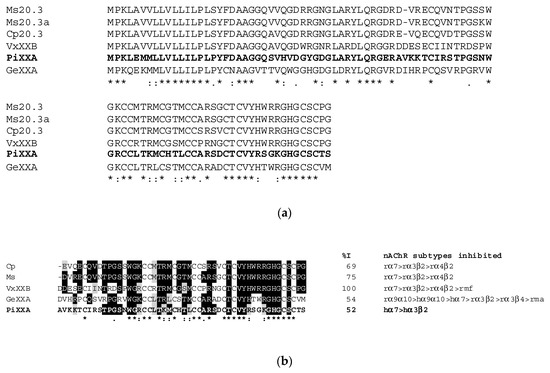 - Kauferstein, S.; Kendel, Y.; Nicke, A.; Coronas, F.I.V.; Possani, L.D.; Favreau, P.; Krizaj, I.; Wunder, C.; Kauert, G.; Mebs, D. New conopeptides of the D-superfamily selectively inhibiting neuronal nicotinic acetylcholine receptors. Toxicon 2009, 54, 295–301. [Google Scholar] [CrossRef] [PubMed]