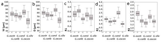 Box plots of cell width (a), cell depth (b), and parameters R1 (c), R2 (d), and R3 (e) used in the morphological analyses (see Section 4.4.1).