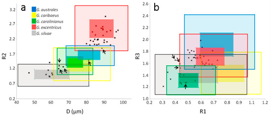 Scatterplots showing the relationships between D (cell depth) and R2 values (a) and between R1 and R3 values (b) in field cells of Gambierdiscus (black dots). The colored squares represent the ranges for standard deviation limits (dark colors) and maximum–minimum (light colors) of D vs. R2 (a) and R1 vs. R3 (b) as determined in the morphological study of cultured cells. The arrows indicate cells whose values are particularly mentioned in the text (Section 2.4).