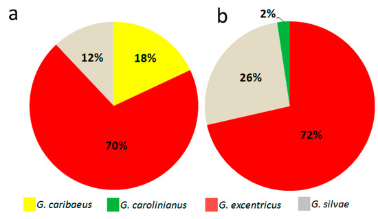 As shown by LSUrDNA sequencing and morphological study, G. excentricus was the most abundant species, detected in 70% of the sequences (23 of 33) (Figure 5a), and with an abundance of 72% (30 of 42 cells) as determined by morphology (Figure 5b). The corresponding values for G. silvae were 12% (4 of 33 sequences) (Figure 5a) and 26% (11 of 42 cells) (Figure 5b). G. caribaeus, by contrast, was detected only in the genetic study, in which it accounted for 18% (6 out of 33) of the sequences. One cell classified as G. cf. carolinianus (2%) was also identified as such in the morphological study.