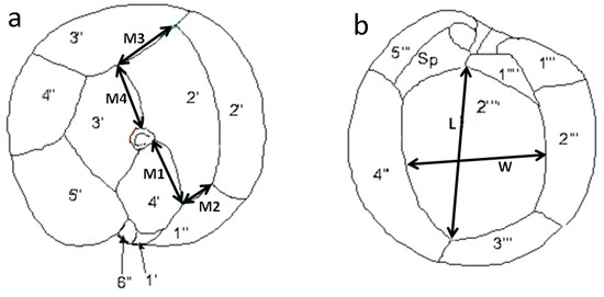 Cell morphology determinations were based on measurements of two thecal plates: the second apical (2′) plate, located on the epitheca, and the second antapical (2″″) plate, on the hypotheca (Figure 7). For the 2′ plate, the lengths of the 2′/4′ (M1 in Figure 7a), 2′/1″ (M2 in Figure 7a), 2′/3″ (M3 in Figure 7a), and 2′/3′ (M4 in Figure 7a) sutures were measured. For the 2″″ plate, the maximum length of the plate (L in Figure 7b) and the width measured from the middle of the left side to the middle of the right side of the plate (W in Figure 7b) were determined. Based on those measurements, the following three parameters were evaluated: (1) R1, defined as the ratio of M2/M3, was used in an assessment of the rectangular vs. the hatchet shape of the 2′ plate; (2) R2, defined as the ratio of M4/M1, represented the position of Po in the lateral edge of the 2′ plate and, therefore, the degree of eccentricity of Po in the cell; and (3) R3, defined as the ratio of L/W, as an indicator of the elongation of the 2″″ plate. Cell depth (D), corresponding to the dorso-ventral diameter, and cell width (W), corresponding to the transverse diameter, were also measured. All measurements were made on calcofluor-stained cells using digital imaging software (ZEN lite, ZEISS Microscopy) and an epifluorescence microscope (Leica DMLA, Wetzlar, Germany) equipped with a UV light source and an AxioCam HRc (Carl Zeiss, Jena, Germany) digital camera.