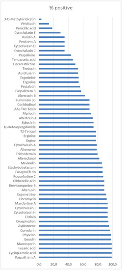 The developed strategy based on Q-Orbitrap HRMS combines the quantitative target determination with the post-target screening approach. The possibilities of the Q-Orbitrap HRMS were further explored by subjecting the full scan data of the pet food samples to untargeted screening with the major data processing parameters set as follows: ionization patterns [M + H]+ and [M − H]−, a minimum peak area of 1 × 105 a.u., a maximum mass window of 5 ppm, and a retention time width of 1 min. The confirmation of the structural characterization of unknown compounds and untargeted analytes was based on the accurate mass measurement, elemental composition assignment, and MS/MS spectrum interpretation. Untargeted data processing was carried out using structural formula finder tool and the online high-quality mass spectral database. The advantage of using a full-scan acquisition mode is to allow the retrospective analysis of samples for the identification of up to 245 fungal and bacterial metabolites included in spectral library database by processing the raw data of the analyzed pet food samples. Fifty-four fungal metabolites were tentatively identified in the here analyzed samples (Figure 2). Cyclopiazonic acid, paspalitrem A, fusaric acid, and macrosporin were the most commonly detected mycotoxins in the assayed samples (98.9%). Cyclopiazonic acid and paspalitrem A are produced by Aspergillus and Penicillium spp. Fusaric acid is produced by some Fusarium spp. Macrosporin is mainly produced by Stemphylium spp. These metabolites have been already found in contaminated cereal crops such as oats, barley, millet, corn, and rice [37,38,39]. In these analyzed samples, emodin was also identified in 97.8% of feed samples. This compound was already reported in Spanish feed and feed raw material but lower incidence (57.1%; n = 62) [40].