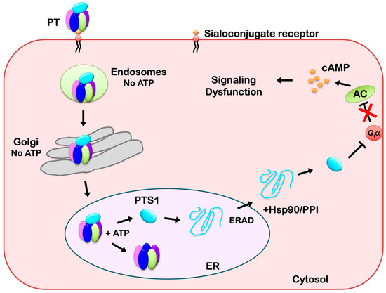 Intracellular Trafficking and Translocation of PT. PT binds to sialoconjugates on the surface of a target cell and is internalized by receptor-mediated endocytosis. It then moves as an intact holotoxin from the endosomes, through the Golgi apparatus, and to the endoplasmic reticulum (ER). The catalytic PTS1 subunit is held in a stable conformation by its association with the B pentamer, but it shifts to a disordered state when the ER-localized store of ATP triggers its release from the PT holotoxin. Unfolded PTS1 is subsequently recognized as ER-associated degradation (ERAD) substrate for export to the cytosol through a mechanism involving Hsp90 and a peptidyl-prolyl cis/trans isomerase (PPI). PTS1 refolds in the cytosol and inactivates Giα through ADP-ribosylation. Inactivated Giα can no longer down-regulate adenylate cyclase (AC), which leads to persistently elevated levels of intracellular cAMP and the disruption of signal transduction.