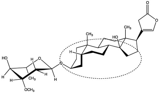 Moreover, these compounds can be categorized based on the source from which they were discovered: Cardenolides (Digitalis purpurea and lanata), which are contained in plant tissues, and bufadienolides, which were first discovered as skin poisons produced by glands of certain species of toads (Bufo marinus) and by some species of plants [,,]. Together with the alkaloids, oleandrin (Figure 1), a cardiotoxic glycoside (structurally similar to ouabain), which inhibits the sodium-potassium pump by binding at the ouabain site of the cell membrane, is responsible for this extreme toxicity. However, oleander contains a number of other toxic components, which are preserved even after drying.