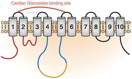 As reported above, due to their similarity with digitalis glycosides, the cardenolides inhibit the Na+-K+-ATPase pump in myocytes (Figure 2). The binding occurs within an extracellular portion of the pump, with N. oleander cardenolides inducing a conformational change in the enzyme by stabilizing it in the transition state, which decreases the active transport of sodium with the consequent excretion of potassium (Figure 3). Increased intracellular sodium levels lead to the inhibition of NCX (Na+/Ca2+ exchanger) and, thus, to an increase in intracellular levels of Ca2+ that are responsible for the cardenolides’ positive inotropic effect and toxicity [,,,,].