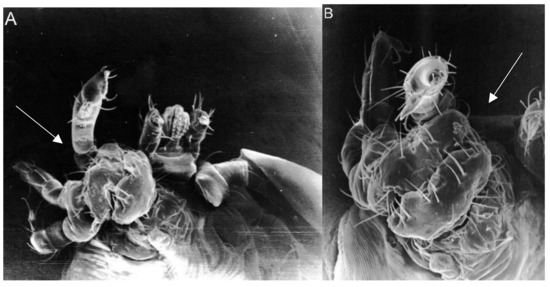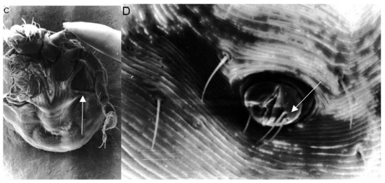 - Ioffe, I.D. Possible correlation between the reduction of legs IV in the larvae and the development of the nervous apparatus in the Parasitiformes (Acarina). In Acarology VI; Griffiths, D.A., Bowman, C.E., Eds.; Ellis Horwood Limited: Chichester, UK, 1984; Volume 1, pp. 286–294. [Google Scholar]