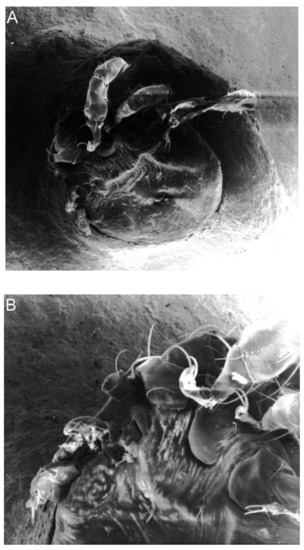 - Alekseev, A.N.; Dubinina, H.V. Some aspects of mite (Oppiidae) and tick (Ixodidae) pathology as a result of anthropogenic pressure. In Acarology IX; Mitchell, R., Horn, D.J., Needham, G.R., Welbourn, W.C., Eds.; The Ohio Biological Survey: Columbus, OH, USA, 1996; Volume 1, pp. 117–120. [Google Scholar]