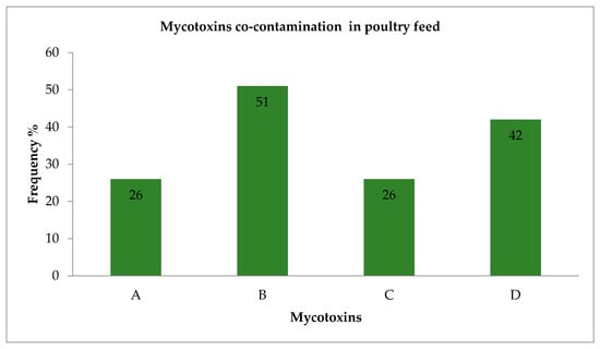 The data demonstrated the co-occurrence of analysed metabolites at various concentrations. Mycotoxins such as DON and ZEN are both produced by Fusarium species found under cool and wet conditions [9]. Mycotoxins such as FUMs, DON and ZEN, produced by Fusarium spp. are most frequently encountered in feeds and feedstuffs [4,8,34,35,36]. In this study, the overall data revealed mycotoxins co-contamination of poultry feed samples (Figure 1). Based on the results of this study, exposure of individual poultry feed samples to multiple mycotoxins simultaneously is highly likely as a result of AFs, FUMs, ZENs, and DONs, as we observed co-contamination of these mycotoxins with the a higher frequency of 51%. Mycotoxins can co-occur even at levels above regulatory limits very often in food and feed commodities causing negative health effects in human and animals.