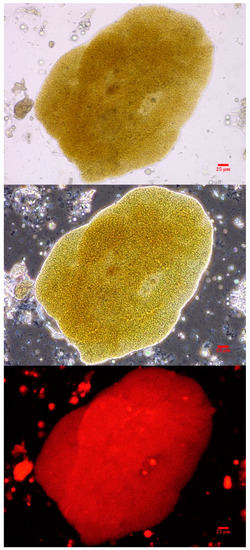 A Microcystis colony observed in the canine vomitus sample acquired within 6 h of exposure. The micrographs are at 400× with brightfield (top), phase-contrast (middle) and epi-fluorescence (bottom). The scale bar represents 25 µm.