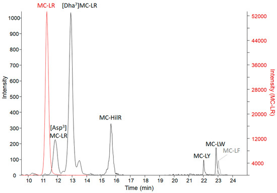 The LC-MS/MS chromatograms of MC variants confirmed present in the C-GR#2 vomit sample with a sum of 14,000 ng g−1 MCs. The MC-LR scale is on the right due to high levels detected in comparison to the other variants. MC-LR > [Dha7]MC-LR > MC-HilR > [DAsp3]MC-LR > MC-LY > MC-LW > MC-LF. Transitions monitored are reported in Table S1.