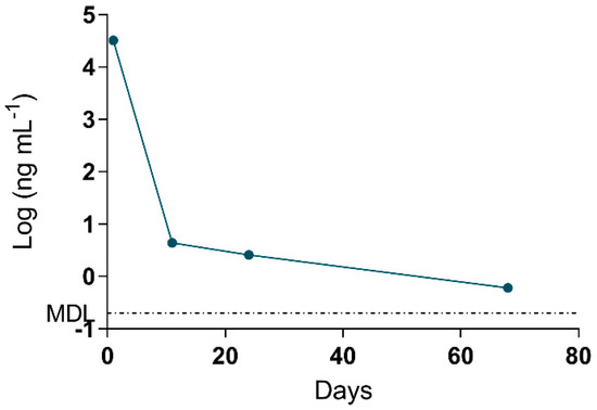 Data derived from the log of total Adda MCs (by MMPB) of the urine collected from one of the surviving dogs (C-GR#2) plotted against days post exposure. Urine was collected within 1 day from initial exposure event, and the animal continued to excrete MC metabolites >60 days post exposure. The MDL for total MCs in urine was determined to be 0.2 ng mL−1.