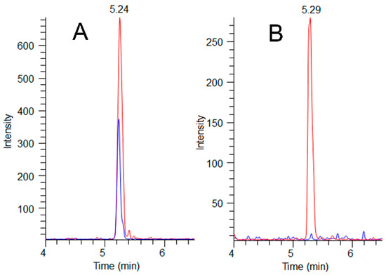 MMPB LC-MS/MS chromatograms (m/z 207→131) showing sample peaks (blue) overlaid with their paired pre-oxidation MC-LR spikes (red) at 200 ng g−1 for A (exposed dog C-GR#1) and 100 ng-g−1 for B (unexposed dog C-CBR). Total MCs detected in the C-GR#1 hair at 72 days post exposure was determined to be 180 ng g−1, illustrating hair as a potential route of MC elimination.