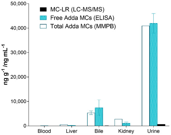 Collection of appropriate specimen type and selection of optimal analytical test are of high importance for accurate diagnosis. It was illustrated that the Adda ELISA provided false positive data and exaggerated assay responses, likely due to non-specific binding to kit antibodies. This highlights the need to confirm any ELISA data, especially for the analysis of matrices more complicated than water, for which the assay was intended. Matrix effects and exaggerated ELISA responses have been observed in other work [36,40] and require, at minimum, a secondary method of confirmation when a positive assay response is observed. In this work, both LC-MS/MS of targeted MCs and total Adda MCs by MMPB were conducted in addition to the MC Adda ELISA. However, due to method specificity, targeting MC variants, such as the MC-LR targeted in this work, under-represents total MCs, both due to MC structural variability and metabolic transformations. Therefore, if only one method is to be used in initial screening of samples in a suspected exposure case, it is recommended that the MMPB method be used. The MMPB approach provided a value representative of total (e.g., bound, free, conjugated) Adda MCs for the evaluated samples with a low detection limit.