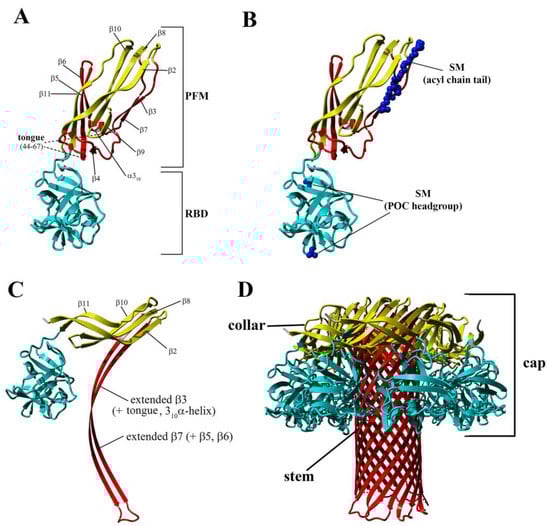Like most pore-forming toxins, lysenin is produced and secreted as a soluble monomer. Crystallographic analyses reveal that lysenin comprises two main structural domains: an N-terminus pore-forming module (PFM) at amino acid position 1–160, which contains a SM-binding site and the membrane insertion loop (position 34–107), and the C-terminal β-trefoil receptor-binding domain (RBD) at amino acid position 161–297, which is responsible for initial binding with the lipid membrane [9] (Figure 1A). The crystal structure of the monomeric form of lysenin bound to SM reveals that toxin binding requires both the hydrophilic (phosphocholine head group; POC) and hydrophobic (acyl chain tail) lipid portions [9] (Figure 1B). Previous crystallographic studies and analyses of the binding of deletion mutants have revealed that lysenin interacts with membranes in a two-stage process [9,12]. First, a patch of positively charged amino acids in the C-terminal domain attracts toxin to the membrane surface and allows the initial binding of the C-terminal domain to the POC of SM via both a hydrogen bond network (including S227, Y233, and Y282) and a salt bridge interaction (K185). Second, two critical tyrosine residues (Y24 and Y26) located in the PFM of the N-terminal domain bind the acyl chain of SM via ring stacking–like interactions [9]. Detailed analysis of the crystal structure of the lysenin/SM complex has revealed that other PFM residues, including K21, Q117, and E128, also interact with the SM head group, creating an additional hydrophilic binding site. The multivalent SM binding site at the C-terminal domain facilitates the interaction of lysenin with clustered SM organized into the SM-rich domains of the plasma membrane, thus increasing the probability of a monomer-monomer encounter [13,14,15,16,17]. In turn, this enables lysenin monomers to create oligomeric structures (prepores) on the lipid membrane surface, which undergo a large conformational rearrangement, leading to insertion into the lipid membrane and pore formation.