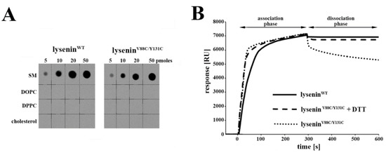 We also demonstrated the ability of lyseninV88C/Y181C to bind to SM based on surface plasmon resonance measurements using liposomes composed of SM mixed with DOPC and cholesterol (molar ratio 1:2:1). Previous studies show that, when oxidized, the double-cysteine mutation V88C/Y131C retains disulfide-trapped lysenin oligomers on the membrane surface upon binding to a SM-containing bilayer. However, when a reducing agent (e.g., DTT) breaks the disulfide bond between these cysteine residues, lysenin oligomers become inserted into the lipid bilayer [22].