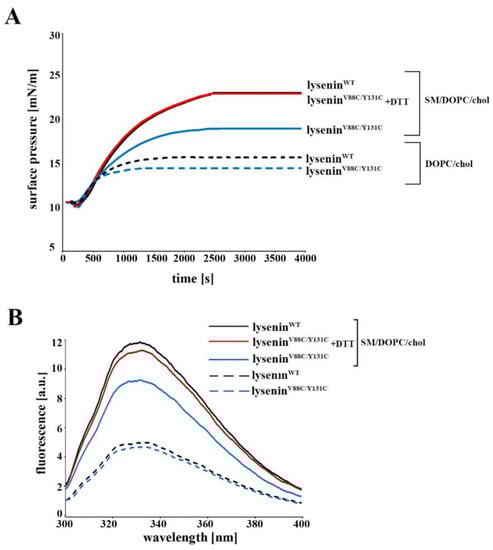 To initiate surface pressure changes in mixed lipid monomolecular layers spread at the argon–water interface, we injected 40 nM lyseninWT and lyseninV88C/Y131C into the buffer sub-phase. For the monolayer composed of SM/DOPC/cholesterol, we found that the surface pressure changes (Δπ) induced by lyseninWT reached 13 mN/m, while those induced by lyseninV88C/Y131C amounted to 8 mN/m (Figure 3A). Addition of 10 mM DTT increased the kinetics of surface pressure evoked by lyseninV88C/Y131C to the level observed with lyseninWT, indicating that cysteine residue reduction allowed incorporation of lyseninV88C/Y131C in a similar manner as lyseninWT. Negligible changes of the surface pressure were found for DOPC/cholesterol monolayers (Figure 3A). Measurement of intrinsic tryptophan fluorescence confirmed that upon binding to SM-containing liposomes under reduced conditions, lyseninV88C/Y131C incorporated into the lipid membrane similarly to lyseninWT. In contrast, in the oxidized state, binding to liposomes left the tryptophan residues of lyseninV88C/Y131C in a more hydrophilic environment (Figure 3B).