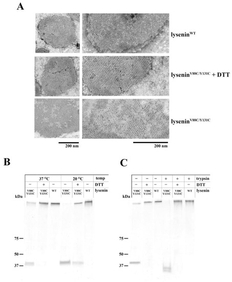 The interaction of lysenin with an SM-containing membrane causes the lysenin molecules to self-assemble, forming highly stable oligomers [18]. Electron microscopy analysis revealed that upon binding to SM-containing liposomes, both lyseninWT and lyseninV88C/Y131C formed well-organized oligomeric structures distributed in a honeycomb-like pattern, regardless of whether a reducing agent was present (Figure 4A). However, in the absence of DTT, lyseninV88C/Y131C clearly created less contrasting oligomeric structures. These findings may suggest that lyseninV88C/Y131C and lyseninWT differ in their orientation relative to the SM-containing membrane or oligomeric form [28].