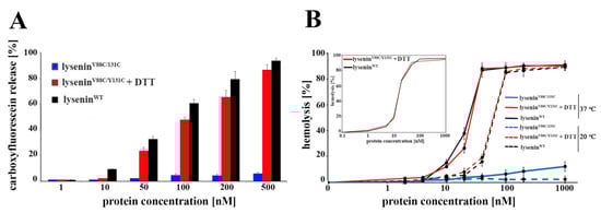 The hemolytic activity of lyseninWT and lyseninV88C/Y131C was measured as previously described [14]. Briefly, serial protein dilutions (up to 1 µM) were incubated for 45 min at 20 °C and 37 °C, with 7 × 107 sheep red blood cells (RBCs), with or without 10 mM DTT. Then the samples were centrifuged at 200× g (5 min, 4 °C), and the level of hemoglobin released from RBCs was estimated by measurement of the supernatant’s absorbance at 405 nm using a NanoDrop 2000c Spectrophotometer (Thermo Fisher Scientific, Waltham, MA, USA). The results were expressed as the percentage of maximal hemolysis (100%), obtained by osmotic lysis of RBCs with water.