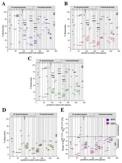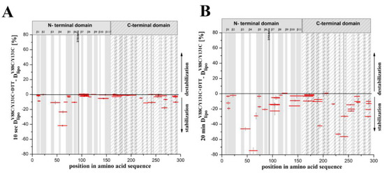 Subtraction plots provided the best visualization of the differences in exchange between corresponding peptides in lyseninV88C/Y131C bound to liposomes vs. in aqueous solution, with or without DTT (Figure 7E). The subtraction plot clearly showed that lyseninV88C/Y181C, with or without a reducing agent, revealed decreased deuteration (stabilization) along its entire sequence upon binding to SM-containing liposomes as compared to in its soluble form. However, two regions in the N-terminal domain of lyseninV88C/Y131C (both oxidized and reduced) demonstrated higher deuterium exchange (destabilization) upon binding to liposomes than its soluble form. These regions included two common peptides spanning positions 64–76 (strand β5), and one peptide spanning positions 114–118 (central part of strand β8) (Figure 7E and Figure 8D,E). We observed stronger stabilization (>60% difference between soluble and liposome-bound forms) in lyseninV88C/Y131C with DTT (Figure 7E; red) compared to without DTT (Figure 7E; blue). The largest differences in deuteration level concerned two segments of the N-terminal domain of the two lyseninV88C/Y131C forms.