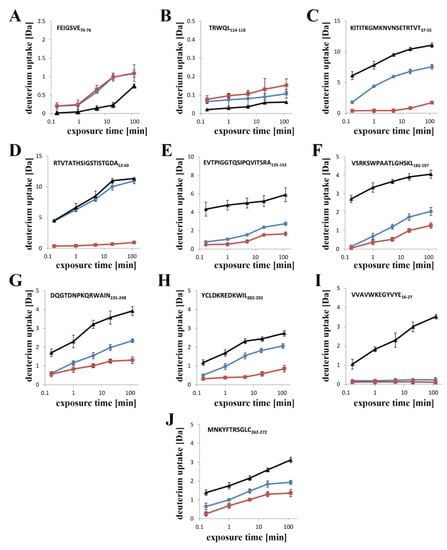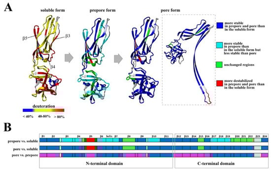 HDX is a complex process whose kinetics depends on both protein dynamics and intrinsic amide hydrogen exchange rates. Two factors may affect the hydrogen–deuterium exchange: solvent accessibility and H-bonding. However, water molecules penetrate protein structures quite efficiently. Therefore, it is believed the main factor protecting from exchange is the involvement of amide in H-bonding, i.e., the stability of local secondary structure elements, while solvent accessibility has minor influence [23]. Generally, due to the fact that protection against hydrogen–deuterium exchange may be best correlated with the “order” in a given region of protein, we interpret the results in terms of structural stability in a given region. Therefore, this method provides useful information regarding the dynamics of structural elements of pore-forming proteins, both in solution and upon interaction with a lipid membrane and enables investigation of the conformational changes accompanying transitions between protein states with high reproducibility and precision [24,25,26].