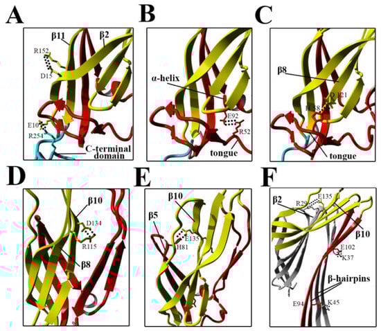 Locations of amino acid residues involved in salt bridge formation in the N-terminal domain of lysenin. Residues involved in salt bridge formation are shown as sticks. Salt bridges (dotted lines) in the soluble form of lysenin are shown between E10–R254 and D15–R152 (A), R52–E92 (B), H58–D121 (C), R115–D134 (D), and H81–E135 (E). (F) Salt bridges in the lysenin pore are shown between R29–E135, K45–E94, and K37–E102 of adjacent monomers. Secondary structures are colored as in Figure 1. Turquoise indicates the C-terminal domain (RBD, receptor-binding domain); yellow indicates the structurally intact region of the N-terminal twisted β-sheet (collar); and red indicates the N-terminal domain.