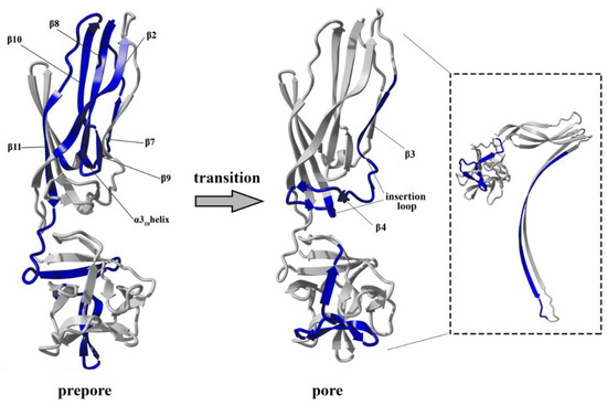 Electrostatic interactions are also important for maintaining contact between adjacent monomers and the stability of the β-barrel pore (Figure 11F) [22]. Our results suggested that stiffening of the N-terminal twisted β-sheet formed by β2, β8, β9, β10, and β11 may force the breaking of salt bridges between the α-helix and tongue (R52–E92), β8 strand and tongue (H58–D121), and β5 and β10 strands (H81–E135), thus leading to slight stabilization of the insertion loop and consequently exposing the β5 strand to solvent and increasing its conformational dynamics (Figure 8A and Figure 11). This orientation is energetically unfavorable; therefore, to decrease the energy state, the insertion loop must be displaced, thus allowing unfolding of the β-hairpin and formation of the β-barrel pore structure.