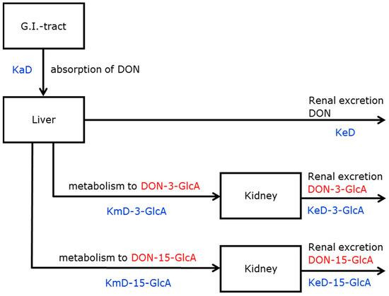In the case of DON, a one compartment model, with intake being the inflow of DON and excretions being the outflows of DON, DON-3-GlcA, and DON-15-GlcA, was not able to describe the data accurately. Therefore, this model was rejected and a more complex model that included the main (lumped) physiological processes, i.e., absorption, distribution, metabolism, and excretion was investigated. This model contained three physiological compartments, i.e., gastrointestinal (G.I). tract, liver and kidneys, with related model variables being the amounts of DON in the G.I. tract and the liver, and the amounts of DON-3-GlcA and DON-15-GlcA in the kidneys, respectively. Distinguished transitions were between G.I. tract and liver (to be interpreted as absorption and transport of DON) and between liver and kidney (metabolism to DON-3-GlcA and to DON-15-GlcA and transport). Finally, outflow occurred from kidney (urinary excretion of DON, DON-3-GlcA, and DON-15-GlcA). Broekaert et al. could also not describe the toxicokinetics of DON after oral administration to pigs with a one compartment model and used a two compartment model instead (applying a central and a peripheral compartment) [9].