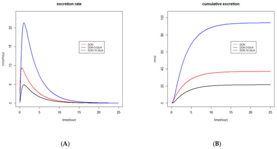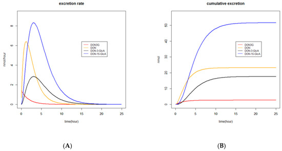 The time to reach the maximum excreted amount (Tmax) of DON, DON-3-GlcA, and DON-15-GlcA in urine, based on the estimated parameters, varied between 0.5 and 1 h. This can also be observed in Figure 2A, where the estimated excretion rates of DON, DON-3-GlcA, and DON-15-GlcA versus time are given.