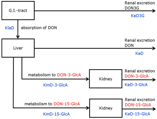 The suitability of two models was tested for the description of the collected urinary data after administration of DON: a simple model and an extended model. The simple model is a 1-compartment model that comprises the absorption of DON and the elimination of DON, DON-3-GlcA, and DON-15-GlcA (shown as model A in Figure S1 in Supplementary Materials). It is a classical (toxico-) kinetic model in which the (one and only) compartment is not a physiologically based compartment but a mathematical presentation of the human body. This model includes 4 rate constants: one for the absorption of DON, one for the renal excretion of DON, and two lumped parameters for the elimination (metabolism and renal excretion) of DON-3-GlcA and DON-15-GlcA. The extended model (I) contains three physiological compartments (gastrointestinal tract, liver, and kidney) (Figure 1). This model includes the absorption and renal excretion of DON and two parallel processes that occur in the liver: the metabolism to and excretion of the two glucuronides. It includes 6 rate constants: one for the absorption of DON (KaD), two for the metabolism to DON-3-GlcA (KmD-3-GlcA) and DON-15-GlcA (KmD-15-GlcA), and three for the renal excretion of DON (KeD), DON-3-GlcA (KeD-3-GlcA), and DON-15-GlcA (KeD-15-GlcA). In addition, the fraction absorbed (Fabs) is also a parameter estimated in the model calculations.