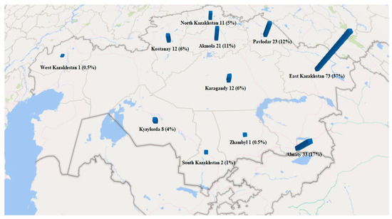 Number of samples collected from particular provinces of Kazakhstan. The highest number of samples were collected from the East Kazakhstan region where highest intensity agriculture is practiced.
