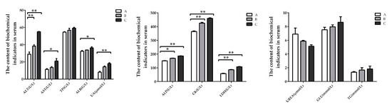 Effect of deoxynivalenol (DON) on serum biochemistry of weaning rabbits (Mean ± SD, n = 10). TP, total protein; ALB, albumin; UREA, blood urea; UA, uric acid; AST, glutamic oxalacetic transaminase; ALT, alanine amiotransferase; ALP, alkaline phosphatase; CK, creatine phosphokinase; GLU, glucose; TG, triglyceride; LDH, lactic dehydrogenase. Group A, control group; groups B and C, DON was added at 0.5 mg/kg BW and 1.5 mg/kg BW, respectively. * and ** indicate the significant difference at p < 0.05 and p < 0.01, respectively.
