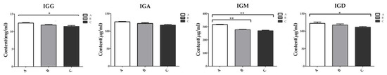 The concentration of IgM reduced significantly (p < 0.05) in groups B and C where DON was added at lower and higher doses, respectively, compared with the control, while the concentration of IgG and IgD lessened significantly (p < 0.01) only when DON was added at a higher dose. The concentrations of IgA had no significant difference (p > 0.05) among the groups (Figure 2).