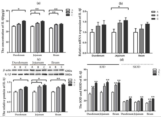 The content of IL-1β in jejunum and ileum were enhanced significantly (p < 0.05) in groups where DON was added at lower and higher doses compared with the control, while that of IL-1β in duodenum increased significantly (p < 0.05) only in the higher-dose group (Figure 4a). The relative mRNA expression of IL-1β in jejunum increased significantly (p < 0.05) in the higher-dose group compared with the control group. The upward trend of relative mRNA expression can be observed in duodenum and jejunum after DON was added; however, there was no significant difference (p > 0.05) among the groups (Figure 4b). The relative protein expression of IL-1β in jejunum increased significantly (p < 0.05) in groups where DON was added at lower and higher doses compared with the control group, while that of IL-1β in duodenum and ileum enhanced significantly (p < 0.05) only in the higher-dose group (Figure 4c).