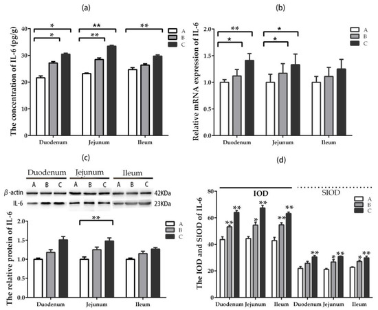 The concentration of IL-6 in duodenum and jejunum increased significantly (p < 0.05) in groups where DON was added at lower and higher doses compared with the control group, while that of IL-6 in ileum increased significantly (p < 0.05) in the higher-dose group (Figure 6a). The relative mRNA expression of IL-6 in duodenum and jejunum were higher significantly (p < 0.05) in groups where DON was added at lower and higher doses compared with the control group. There was no significant difference in ileum among the groups (Figure 6b). The upward trend was observed in three intestinal segments among all groups. However, the relative protein expression for IL-6 in jejunum enhanced significantly (p < 0.05) in the higher-dose group compared with the control group (Figure 6c).