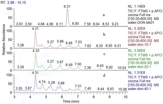 The total ion chromatograms (TIC) of DON and its degradation products which treated by various concentrations of gaseous ozone were shown in Figure 1. The retention time (RT) of DON was 6.31 min detected by UHPLC-Q-Orbitrap MS (atmospheric pressure chemical ionization source positive ionization mode), and 20 μg mL−1 DON was completely degraded after three concentrations of gaseous ozone treatment, most of the degradation products distributed from 4 min to 8 min, almost all of them were unknown compounds.