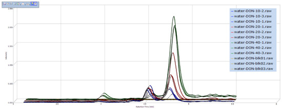 In our study, the screening of degradation products was performed using a differential expression analysis software SIEVE 2.0, which combined with Q-Orbitrap. After collected by Xcalibur 3.0 (data collection software of Q-Orbitrap), the original experimental data were imported to SIEVE 2.0, and the results were shown as the example in Figure 2. From Figure 2, the compound has chromatographic peak in the same RT and the intensity was different after detoxified by three concentrations of ozone, the higher ozone concentration, the higher ion intensity, so this unknown compound was the possible degradation product of DON. In addition, validation of the degradation products could be completed by comparing SIEVE figure with the RT and exact masses of the primary mass spectrogram. With this screening method, ten ozonation products of DON were analyzed and the information was listed in Table 2.