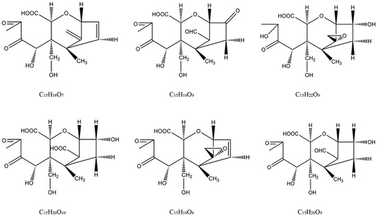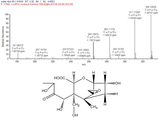 The MS/MS spectrum of degradation product C (Figure 4) was provided as an example to illustrate the analyzing process. The formula of degradation product C is C15H22O9, which were three oxygen atoms and two hydrogen atoms more than DON, and one degree of unsaturation lower than DON. The mass spectrum of product C showed a specific molecular base ion at m/z 329.12262 ([M+H-H2O]+), the key fragment ions were m/z 311.11206, which lost a molecule of H2O and m/z 283.11719, which lost a group of CO, and the fragment ions because of the fragmentation of ring. According to the reaction rule between ozone and DON, the ozone firstly attacked the C9-10 double bond, and then generated carboxyl through the addition reaction. Based on the above analysis and mass spectrometry fragmentation pathway, the possible structure of product C was shown in Figure 4.