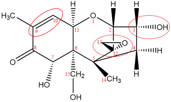 Relationship between chemical structure and biological activities of many mycotoxins has been described in the literatures [23,24,25], all the results indicated that, toxicity of mycotoxin was closely related to functional groups of the molecular structure, which induced the theoretical basis for investigation of mycotoxin detoxification. The most important structural features that are known to affect toxicity activities of DON are as follows: the unsaturated bond at C9-10, the presence of the 12, 13-epoxy ring, and the presence of hydroxyl or other groups at appropriate positions [26], as shown in Figure 7.