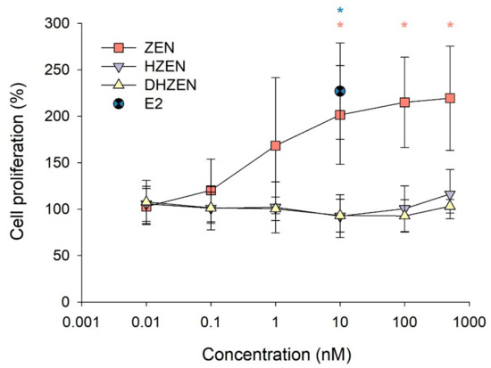 MCF-7 cell proliferation (%) after treatment with 0.01, 0.1, 1, 10, 100, and 500 nM ZEN (positive control), HZEN or DHZEN for 144 h. Cell control (= 0.05% DMSO) was set to 100%. 17ß-estradiol (E2, 10 nM) served as additional positive control. Each result represents the mean ± SD of five independent experiments (with three technical replicates per experiment). Significant differences are indicated with * (p < 0.05). The blue * only concerns the comparison between Control and E2.